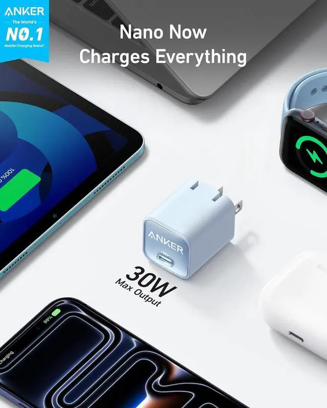 Nano Now Charges Everything: Upgraded with a 30W output so now you can charge your earbuds phone tablet and even your MacBook Air with a tiny charger.