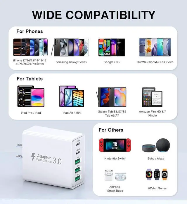 USB C Charger: This fast wall charging plug has a maximum output of 50W which can fully charge your devices faster compared to ordinary plugs greatly reducing your waiting time. Let you enjoy super fast charging bring faster and more efficient charging experience for all devicesWide