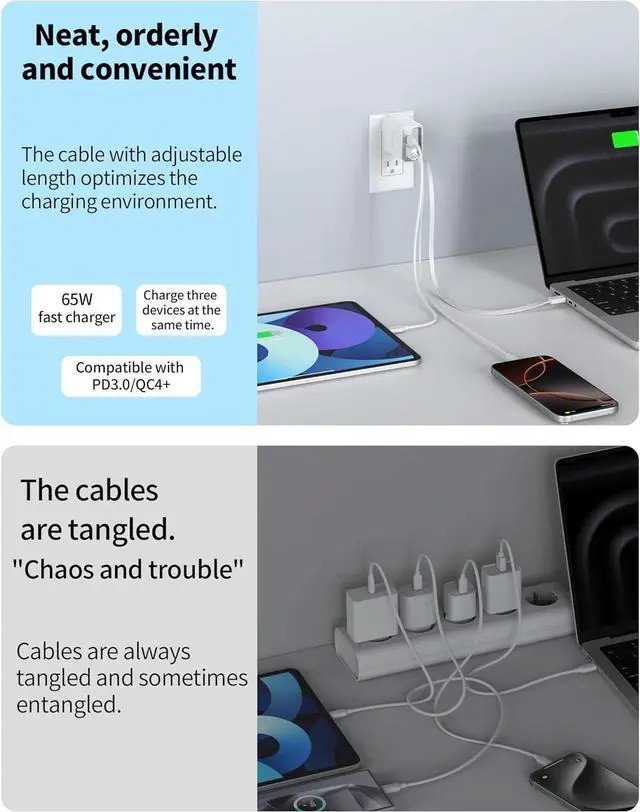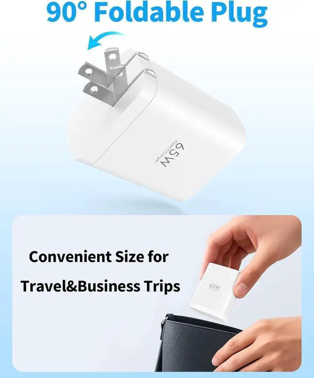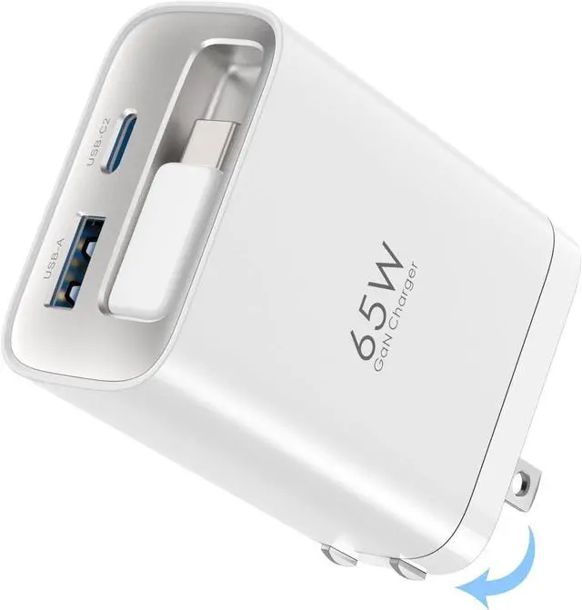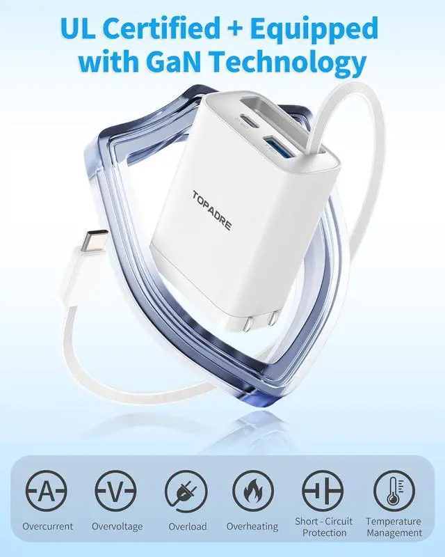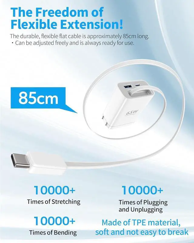 GaN Charger: TOPADRE 65W Type-C fast charger is a multifunctional charger with a built-in retractable USB-C cable that can be freely extended from 3cm to a maximum of 85cm which is most suitable for wiring arrangement around the desktop and storage during travel. Folding plug design even business bags and suitcases can be compactly stored in pockets.