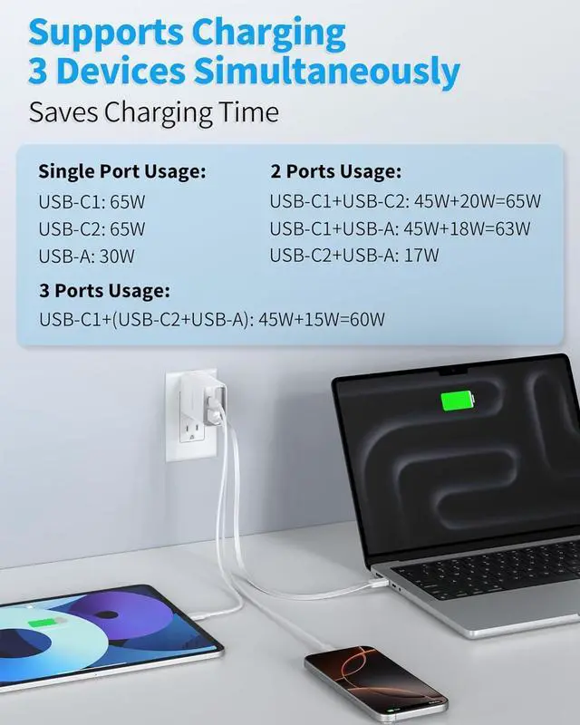 3-in-1 PD Charger: TOPADRE 65W charger is equipped with two Type-C ports (with USB-C2&USB C winding cable *65W Max) and one USB-A port *30W Max which supports three devices to charge at the same time. The output power of 65W can charge all USB-C devices from Macbook series to smart phones and the compact charger is easy to carry which can be easily handled whether traveling or at home! GaN III