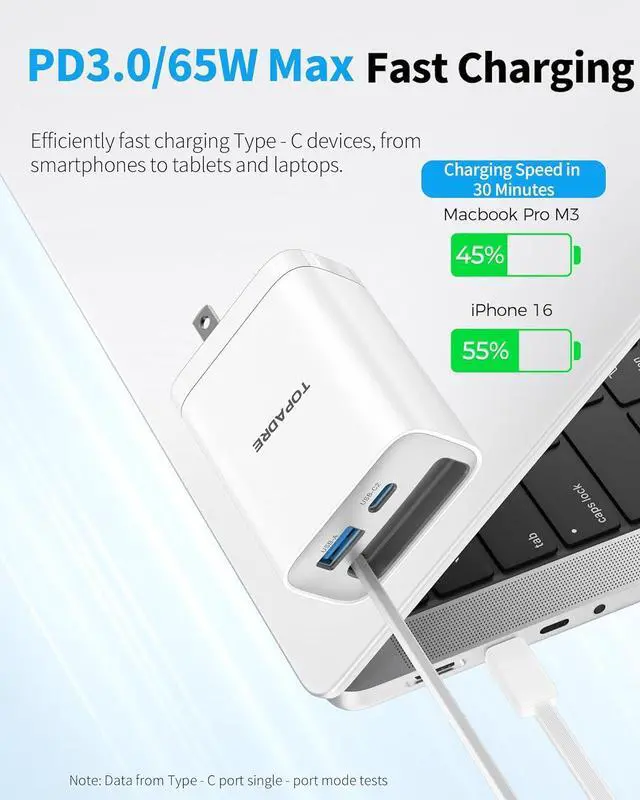 Wide Compatibility: USB charger supports charging standards such as PD 3.0 QC4+ QC 3.0 QC 2.0 PPS SCP FCP AFC and PE+. TOPADRE charger 65w can charge up to 65W from C1/C2 port in single-port mode charging MacBook Pro/Air iPhone 15 14 Pro/Pro Max/Plus galaxy s23/s22 iPad and other devices supporting USB-C at lightning speed. 24-Month Warranty &24-Hour