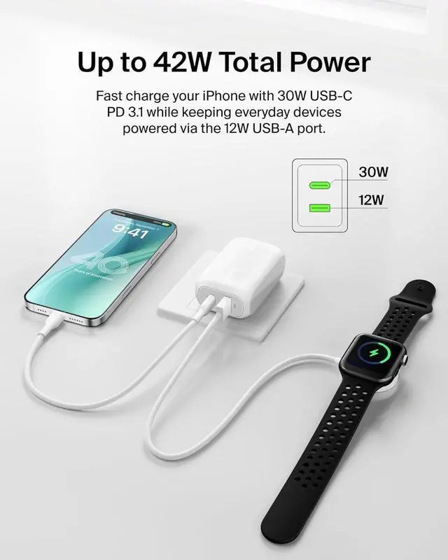 FAST CHARGING TECHNOLOGY: This 42W USB-C wall charger lets you fast charge an iPhone 16 or Galaxy S25 from 0-50% in just 24 minutes allowing you to spend less time charging and more time carrying out the tasks of your day.