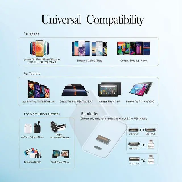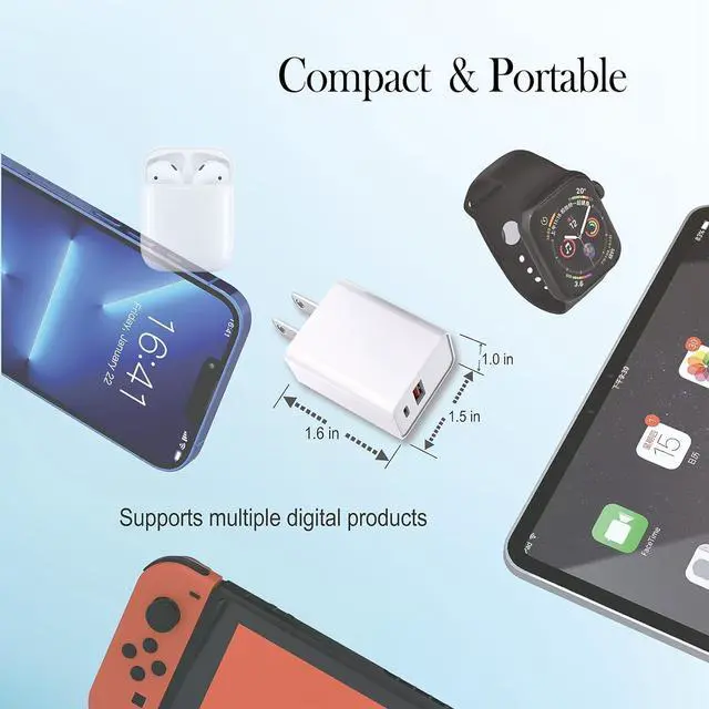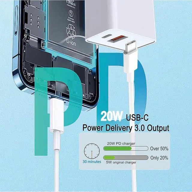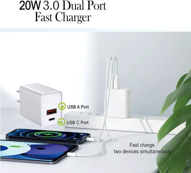 Powerful 20W outputThis fast usb c charger block offers a stable and powerful 20W charging power which is three times faster than the standard 5W charger allowing you to charge your devices quickly and save precious time. Whether it's a smart phone a tablet or other compatible devices you can experience an unprecedented fast charging experience Dual-port Convenience This dual port usb c charger block has two ports and can power almost all smartphones iphones or Android phones. Its dual-port design enables you to charge two devices simultaneously which means you can say goodbye to the trouble of waiting for one device to be fully charged before plugging in the other.