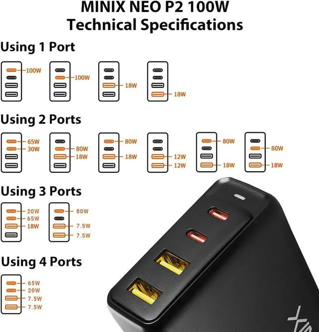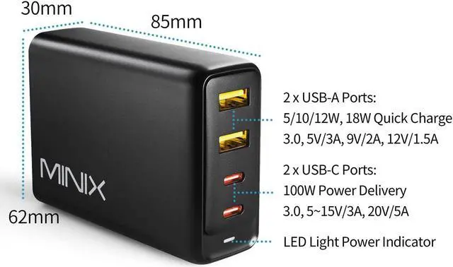GaN Charger]: Powered by the latest Gallium Nitride (GaN) Technology MINIXs 100W Turbo 4-Port GaN Charger delivers charging in a smaller form factor design compared to traditional silicon-based chargers.