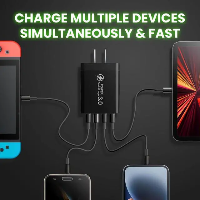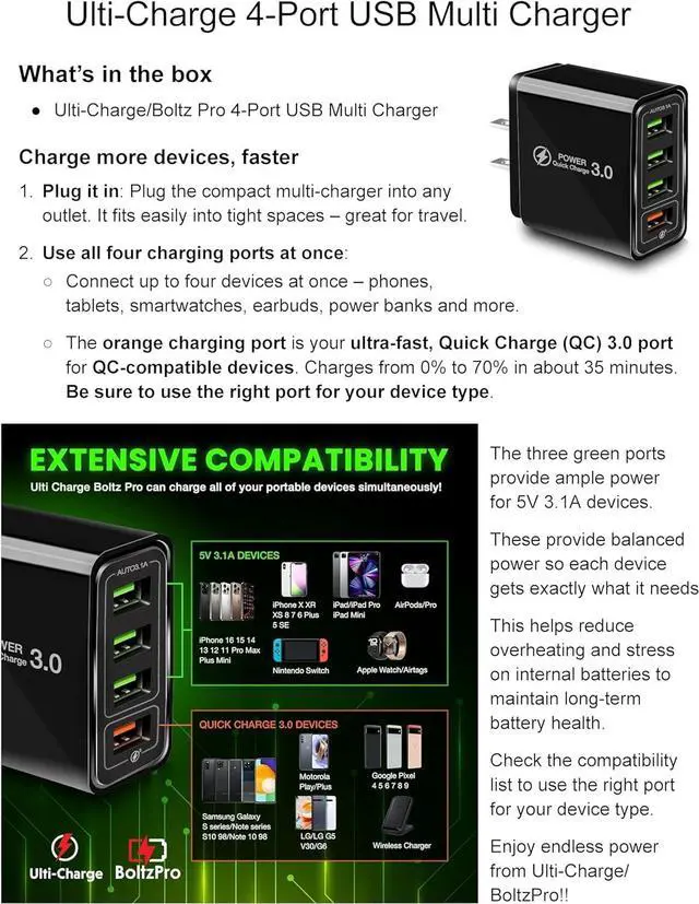 ?????????????????????????? -????????????????????????????: Ulti Charge 4-Port QC 3.0 USB Charger Block aka Boltzpro lightning fast charger will charge up to four devices simultaneously. Ulti-Charge 4-Port QC 3.0 charger feauturing advanced intelligent power distribution ensures optimal charging speed for each device. Featuring fast charging technology this compact charging hub reduces clutter and keeps your space organized. Perfect for all your gadgets from tablets to smart devices.??????????????????????????????????????????????????????????: Equipped with Ulti Charge Quick Charge 3.0 the Boltz Pro Charger usb charger block charges compatible devices up to 4x faster than standard chargers. Go from 0% to 70% in just 35 minutes for QC compatible devices saving time and providing convenience. Whether charging tablets power banks or other gadgets the ulti-charge 4-port quick charger ensures you stay powered up with minimal wait time.????????????????????????????????????????????: The Wall Charger Ulti Charger 4 ports with quick charger is designed for use with a variety of devices ensuring versatility for all your charging needs. Its lightweight compact design is perfect for home office or travel. The Boltzpro charger wall charger block fits easily into any outlet and offers multiple charging options wherever you are.???????? &??????????????????????????????????????????????????????: Safety is at the forefront with the ulti-charge quick charger offering overcharge overcurrent and overheat protection. Surge protection ensures that all devices are charged safely and efficiently preventing damage during power fluctuations. This ulti charge phone charger usb wall charger block and Multi-Device USB Charging Station delivers fast and reliable charging without compromising safety.?????????????????????????? -??????????????????????: Designed for portability the ulti charge fast charging block is compact enough to fit into any bag. Whether youre commuting traveling or working remotely this ulti charge quick charge usb charging hub allows you to charge multiple devices wherever you go. An essential for professionals frequent travelers and families with multiple gadgets.