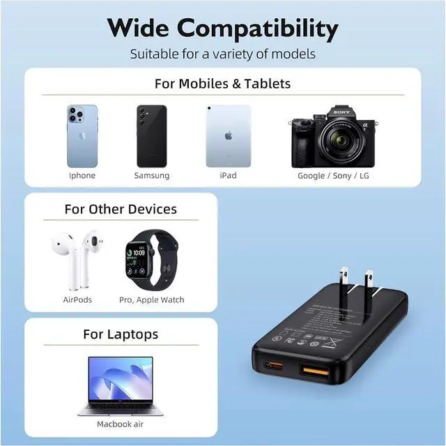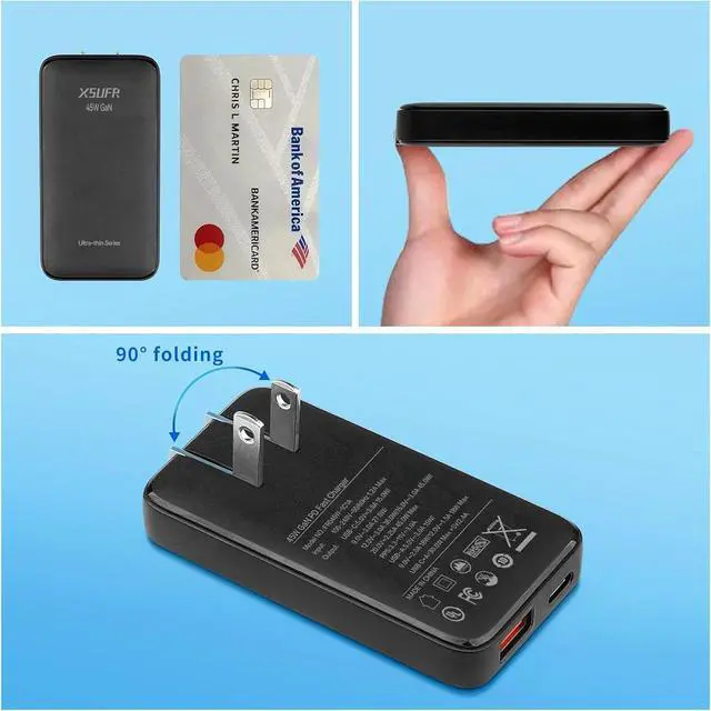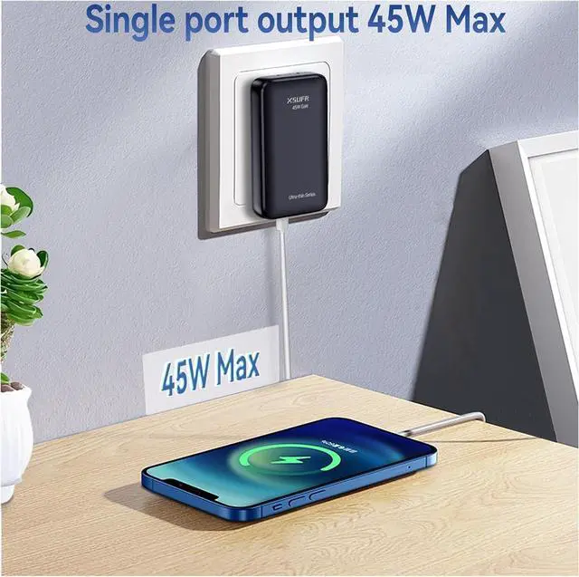 Super Fast Charging: When the 45w super fast charger is used as USB-C port the maximum output power is 45W. The 45W usb c charger charge the latest phones at full speed with Super Fast Charging(Super fast charge for Galaxy S22+ from 0% to 50% in just 30 min). Charge a 2022 MacBook Air at full speed. Charge an iPhone 14 up to 3X faster than with an 5W chargerDual port fast charging: The 45w usb wall charger charges 2 devices at high speed simultaneously with a total 15W of USB-C Port and USB-C Port. Ultra-Slim and foldable plug designThe 45w flat usb wall charger is easy to carry easy to fit in your pocket or backpack convenient for travel. In addition the flat wall charger can be on any wall socket on the back of sofa bed and other furniture not taking up space.