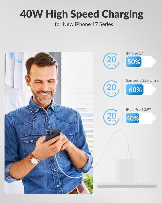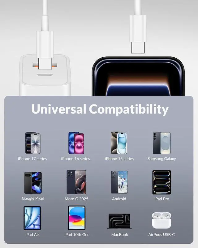 Compatibility: 40W USB C Fast Charger Compatible with iPhone 17/17 Pro/17 Pro Max/Air/16 Pro Max/16 Pro/16 Plus/16/16e/15 Pro Max/15 Pro/15 Plus/15 iPad Pro 13/ 12.9 /11 inch iPad Air 6th/5th/4th iPad Mini 7th/6th Generation iPad 10th/11th Generation Wath Series AirPods Galaxy S25/S24/S23/S22 Pixel 10/9/8/7/6 Moto Tablet Android Phone and moreWhat