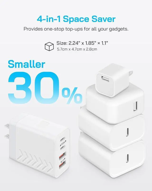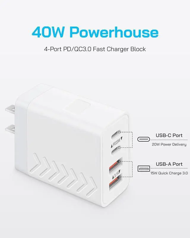 [PD+QC 3.0 40W Fast Charging] Our 40W powerhouse combines PD + QC 3.0 tech to deliver faster charging. The USB-C ports deliver powerful 20W charging - enough to take your i Phone from 0% to 58% in just 30 minutes (3x faster than standard 5W chargers). The USB-A ports provide reliable 15W output perfect for older devices ensuring everything charges quickly and efficiently. [4-Port Compact Charging Hub] With 2 USB-C + 2 USB-A ports packed into a charger smaller than a deck of cards you'll finally win the battle for airport lounge outlets and keep your nightstand cable-free.