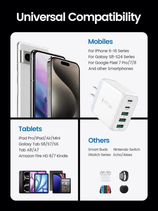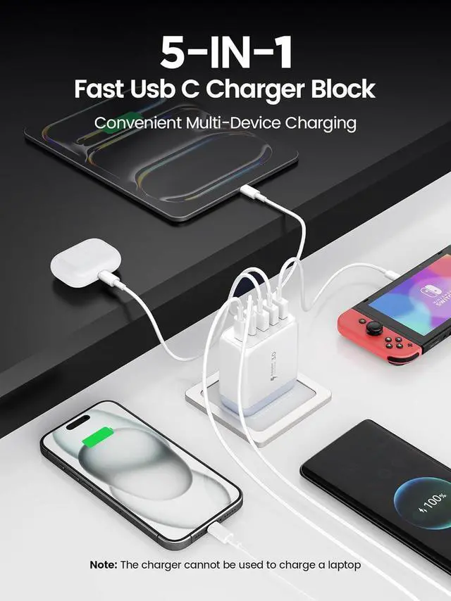 Works with All Devices: Thanks to its special 5-port design this USB-C charger plug is compatible with nearly all electronic devices. It works with iPhone models from 7 to the latest iPhone 17 various iPad models Galaxy phones including the S24 and Note series as well as LG Motorola Google Pixel Watch AirPods Watch Galaxy Buds and many other digital devices.