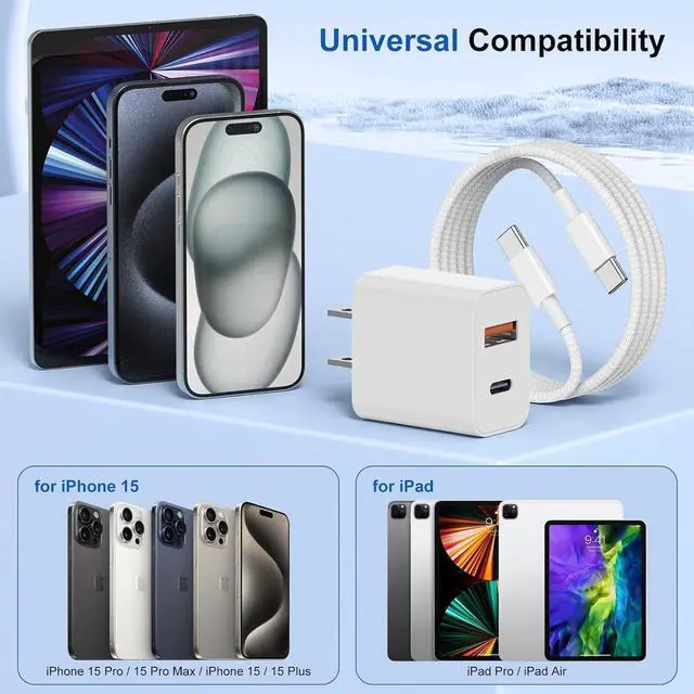 Dual Port Charging BlockCompatible with both USB Type-A and USB-C this USB C charger block can power up just about any smartphones i Phone or And roid phone. Its dual ports allow you to charge two Phone at once20W Fast ChargerEnjoy fast charging with 20W max output for your iPhone phones and other devices. The USB C port can charge your new i Phone up to 59% in 30 mins - 3 times faster than a standard 5W chargerWide CompatibilityThis Dual port usbc charger works with a huge range of mobile devices including iPhone 16/iPhone 16 Pro/iPhone 16 Plus/iPhone 16 Pro Max/i Phone 15/iPhone 15 Pro/iPhone 15 Plus/i Phone 15 Pro Max/X/8/7/6/5/SE Google Pixel 5/5XL/4a Galaxy S20/S10/S10e Note 9/8 LG G5/G6 iPad Air Pods and moreSuperior SafetyConforms to the ETL safety standard this USB-C wall charger is equipped with a wide range of safety features including temperature control overvoltage and overcurrent protection so you can rest easy while charging your devicesWhat You Get1 x Dual Port USB-C Charger Block 2 x 60W Fast Cable 6Ft welcome guide 18-month warranty and our friendly customer service