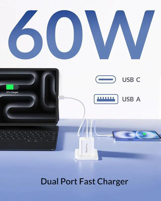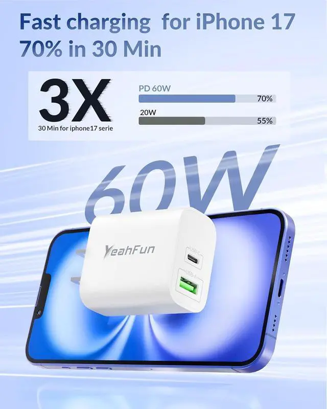 60W Super Fast Charger BlockIt can provide you with up to 60W fast charging speed charge the iPhone 17/Pro Max/17 Air/16/16e/15 up to 70% within 30 minutes. charge for iPad 11th up to 50% in 30 minutes 20% Faster than 20W USBC Charger Block. 2-Port Simultaneously ChargingThe dual-port design enables the simultaneous use of USB-C and USB-A ports powering two devices at the same time without affecting speed or performance. Minimize waiting time and frees you from messy chargers with various interfaces. Safety and ReliableThis 60W fast charger multiple built-in safeguards protects your devices against damage caused by short circuit over-current over-voltage over-heating and over-charging issues.