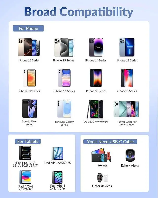 Universal CompatibilityCompatible with iPhone 17/Pro Max/17 Air/16e/16/15/14/13/12/11/8/7/6 series iPhone X/XR/XS/SE series iPad Pro 11 inch 4th/ 3rd/ 2nd/ 1st iPad Air 5th/4th iPad Mini 6th/7th iPad 11th/10th Generation and Galaxy S25/S24/S23/S22/S21 Google Pixel 10/9/8/7/6/5 Android phonesWhat You Get 4 X 60W 2-Port Fast Charging Block. 2 year worry guarantee.