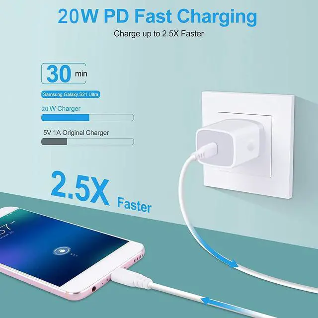 Charging: Equipped with a USB Type C port the 20W PD 3.0 USB C Charger cube provides you Charge the full charger Pad Pro 12.9 in 2.8 hours 2.5X faster than standard USB charger. The galaxy wall charger (cargador para) Type c delivers up to 3 Amp to give your phone power at a much faster rate than your standard 1A or 700mA charger enables your battery from zero to 50% in just 30 minutes 75% faster than standard chargers. Safety Insurance USB C Android charger: The intelligent circuit design for 20W USB C charger Block protects against short circuiting over-heating over-currents and over- charging. The phone charger box Charging stops when battery is full. 6ft Android Phone USB C to C