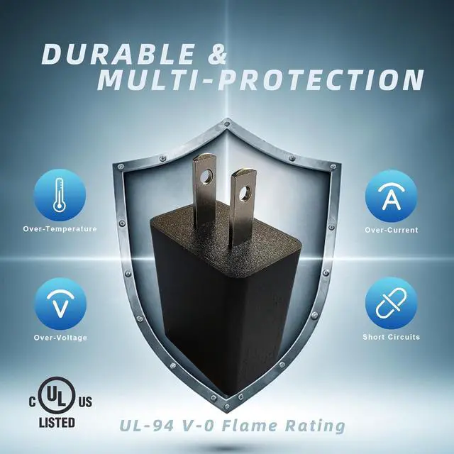 Stable & Reliable Multi-Protection: Crafted with unwavering precision and engineered for long-lasting durability this charger boasts an exceptional mean time between failures and lifespan. It comes with UL certification and multiple protective features effectively shielding it from lightning strikes over-temperature over-voltage over-current and short circuits. Its sturdy PC shell is drop-resistant insulated for high voltage and has a V-0 flame rating providing robust protection for the charger's internal structure and preventing accidental damage to devices or injuries to users.