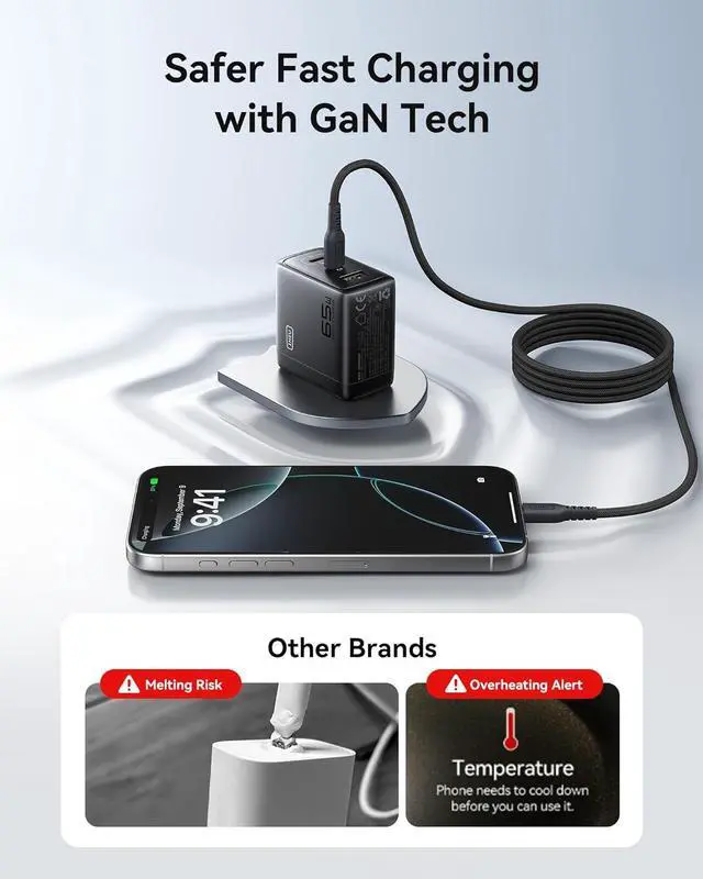 GaN Tech: GaN technology makes it ultra-compact for tight spaces yet powerful enough to charge three devices simultaneously. -10 Cooler