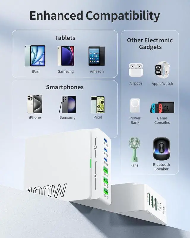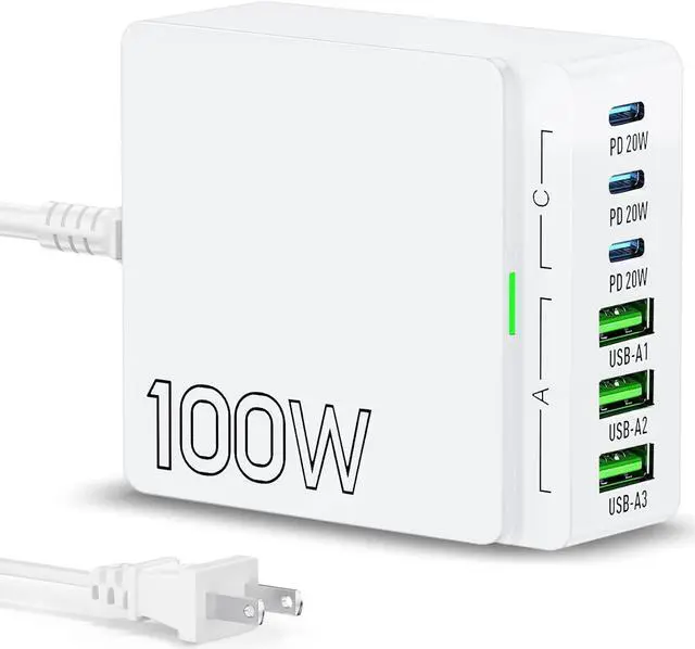 Fast charging is limited to smartphones and tablets; older models may not be compatible so check your devices specifications first. A certified fast-charging cable is also required for fast charging with compatible devices. Enhanced CompatibilityBoasting a total power output of 100W for 3 PD TYPE-C ports (20W Max) and 3 USB-A ports (15W Max) our USB charger station can meet your different charging needs for almost any kind of electronic devices such as smartphones (iPhone16 Pro Max Other Android Phone) tablets wireless earbuds smartwatches bluetooth speakers table lamps game consoles etc. You can power multiple devices with just one charger instead of having to plug into several wall sockets.
