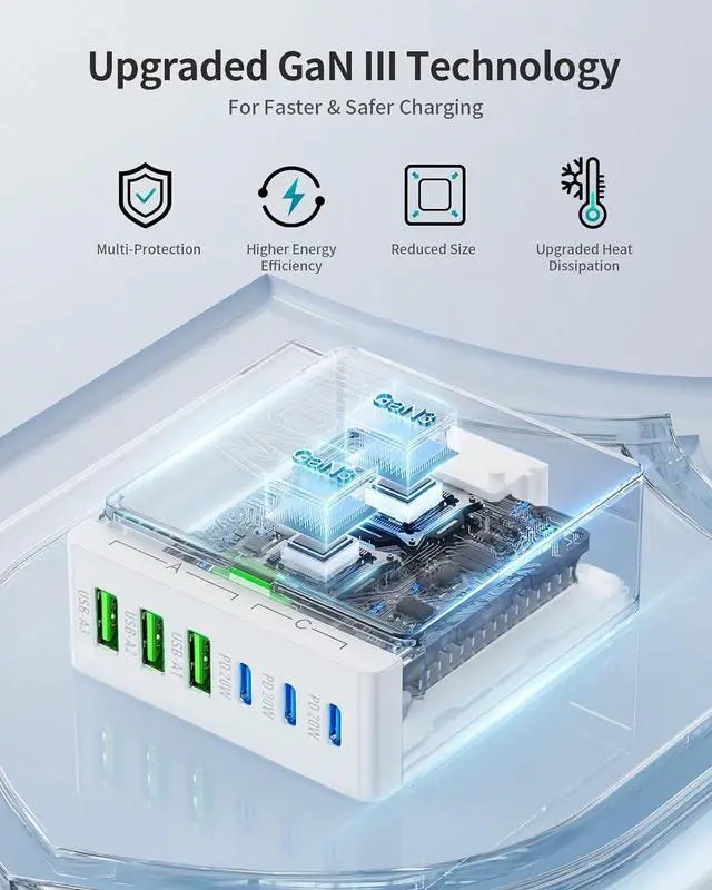 6-in-1 USB Charging Station Nowadays we have more and more electronic devices and need to power them up frequently. The versatile charger is an essential accessory whether you're at home or in the office. Our charger block offers 6 USB ports to charge multiple devices helping simplify your charging settings. With its intelligent charging technology it can automatically detects and delivers the optimal power output for each connected device ensuring fast and efficient charging. Fast ChargingThis product features 3 Type-C ports and 3 USB-A ports with a total power of 100W. Only the Type-C ports support fast charging (max 20W per port) while USB-A ports do not (max 15W per port).