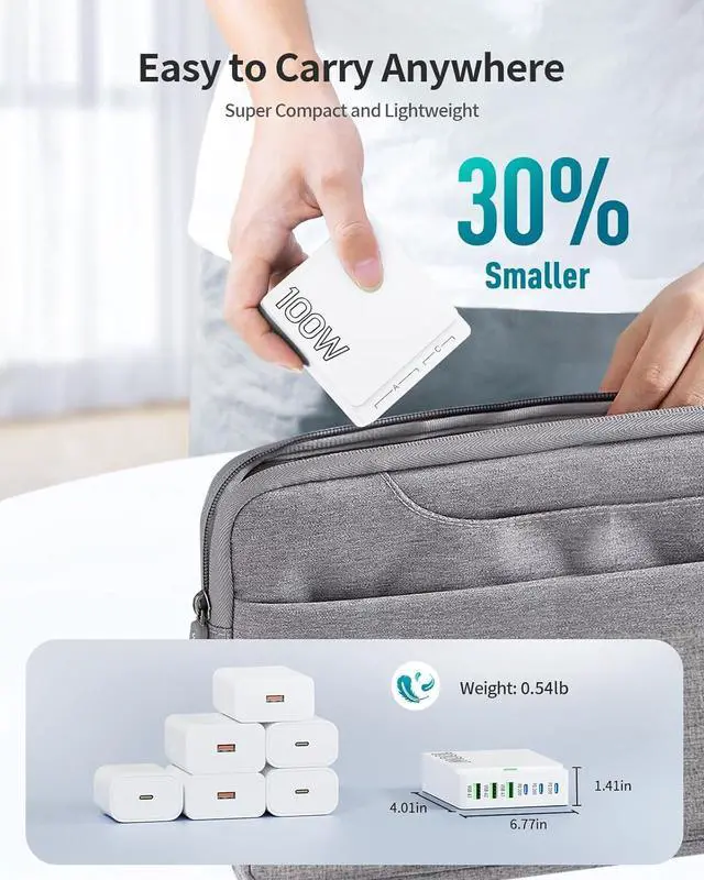 Perfect Travel ChargerIt's annoying to pack tons of chargers when traveling you may need to bring different types of adapters for your USB-C devices or USB-A devices. Just bring this one for all charger is enough. It is sleek and lightweight for carrying especially suitable for the family trip with multiple charging options. With a detachable 5ft long power cord the size of this item is 6.77 * 4.01 * 1.41 in( 0.54 lb it is so convenient to store and charge with no limitation. What youll Get You will get 1* 6-in-1 charging block 1* 5ft power cord 1*User Manual.
