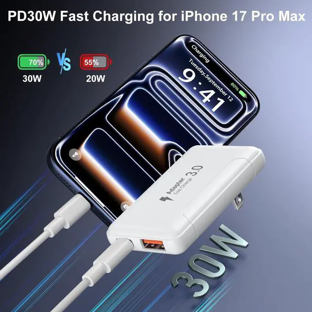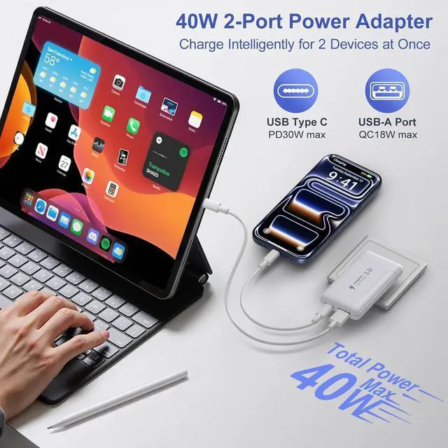 Charger Block: OKRAY flat dual USB (USB-C & USB-A) wall charger supports a total output power of 40W max allows you to charge 2 devices simultaneously and quickly but not overheating. Really save your time and space. Besides PD30W USB-C port can fast charge iPhone 17/16/15/14/13/12 series from 0 to 70% in about 35 minutes fast charge Galaxy phones from 0 to 100% in about 1 hour with the fast charging cable (NOT content charging cable).