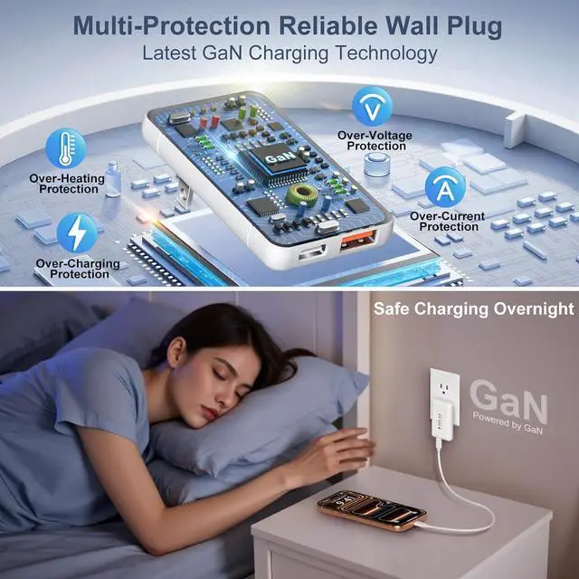 Safe & Reliable Wall Plug: Build-in smart IC and GaN technology brings better power and performance such as protect against extreme working condition (like over-charging/over-current/over-heating) automatic recognize different devices to charge with effect and automatic stop charging when power is full. In addition durable PC fireproof shell is another excellent safeguard that protect your device maximally.