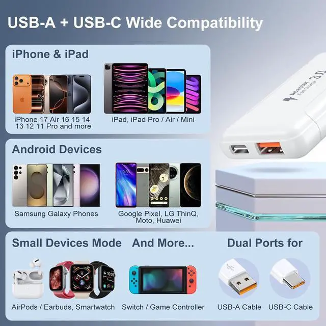USB-C+USB-A Broad Compatibility: Works for all standard USB-powered devices. Perfect compatible for iPhone 17/Air/17 Pro/17 Pro Max/16e/16/16 Plus/16 Pro/16 Pro Max/15/15 Plus/15 Pro/15 Pro Max/14/14 Plus/14 Pro/14 Pro Max/13 12 11 Pro Max Mini/SE 3/XR/XS/X/8 7 6 Plus. iPad Mini/Air/Pro /Max iwatch ultra 3/11/SE 3/10/9/8/7/6. Compatible for Galaxy Z Fold/Z Flip Galaxy S25 Ultra/S25 Edge/S24 Ultra/S24+/S24/S23/S22/S21/S20 Galaxy A16/A15/A14/A56/A55/A54/A53/A50/A71 Galaxy Note 20/10/9/8. Google Pixel 10 Pro/10/9/8/7/7A/6/5/4A/4XL LG MOTO Android Phones&Tablets. E-reader Portable Power Bank Smartwatches Earbuds Camera Switch and more.