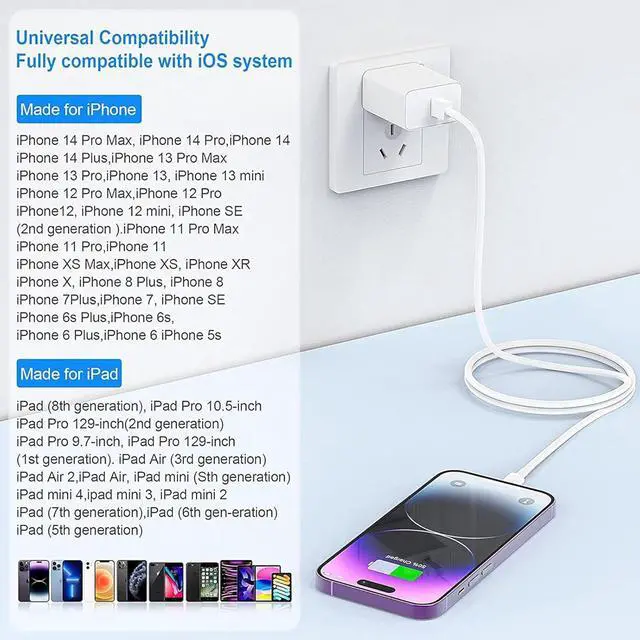 Lightning charger for iPhone 14 has multi-potent safety system ensures complete protection for your lightning devices.?? Hassle-Free Warranty PD USB-C Power Adapter Blocks and 10ft extra long USB C to Lightning Fast Charging Data Sync Cables. Also comes with a 1-year worry-free warranty and 24/7 friendly customer service. Any problems with this iPhone 11 12 13 14 fast charger certified please contact us for fast support and we will reply within 12hrs.