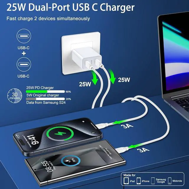 PD Charger Fast Charging: 25W 2 port usb c wall charger super fast charges for all devices which support QC 4.0 QC 3.0 QC 2.0 and PPS PD 3.0 protocol like cell phones tablets pad. Google Pixel 8a 8 Pro 8; Galaxy A17 A16 5G A15 5g A35 A55 A25 S25 Ultra S25+ S25 Edge S25 S24 ultra S24 plus S24 Z Fold 7 6 5 4 3 Z Flip 7 FE 7 6 5 4 3 A24 4G A14 5G A13 A54 A34 A53 A03s S23 S23+ S23 Ultra S21 FE A23 A33 A52 A32 A12 S22 S21 S20; iPhone 16e 16 15 Pro Max 15 Plus 15 Pro 15 and more. 25W Dual Port Fast