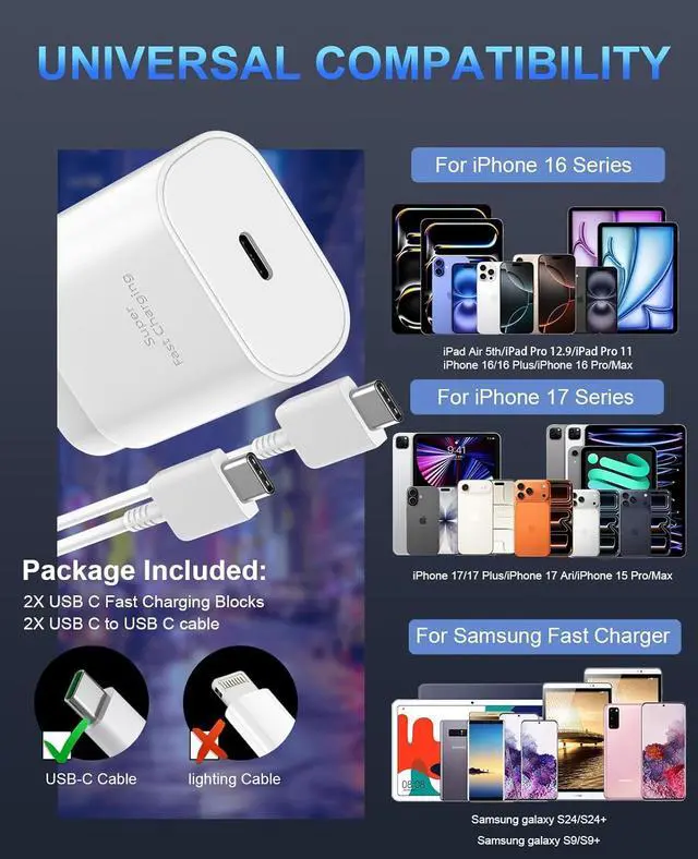 Please be noted that iPhone 14/13/12/11 Pro Max/ iPhone X/XR/XS etc. are NOT suitable for this USB C to USB C charging cable. 60W 10Ft iPhone 17 16 15 Charger USB C Cable Cord The iPhone 17 16 15 Pro Max Charger with 10 ft Long type c to c charging cable cord supports PD 3.0 fast charging speed max up to 20V/3A (60W) also support 480Mbps Sync/Data transfer speed; and the 10-Foot length long enough to be convenient to charge your device in bedroom sofa officeUSB C iPhone 17 16 15 Charger Block Safety and Reliable 30W USB C Pro Fast charger Box has multi protection safety system protect your iPhone 17 16 15/iPhone 17 16 15 Pro/ iPhone 17 16 15 Pro Max from over current over voltage short circuit and overheating ensure charge your device safety and longevityWhat Your Get2pack USB C iPhone 17 16 15 Fast Charger Block + 2pack 10ft iPhone charger fast charging cable cord.
