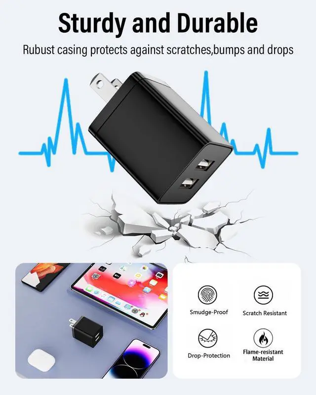 Dual-Port 12W Power Adapter & Universal USB-A CompatibilityThis power adapter delivers 12W fast charge via dual ports ( 2.4A per port) perfect for smartphones tablets and Bluetooth headphones. Fully compatible with iPhone 17/16/15/14 series iPad Pro/ Mini/ Air iPad iPad (4th - 10th Gen) iPod Touch/Nano Beats Pill Galaxy S25/S24 Google Pixel LG Nexus HTC Wildfire Motorola Blackberry Nokia and all USB-powered Android devices. 40% faster than standard 5W charging blocks4-Pack Charging Brick Bundle for Home & Travel Save 35% with 4 premium charging bricks - ideal for bedrooms offices and travel bags. The 2.19 -inch cube design fits snugly into any outlet plug without blocking adjacent sockets.