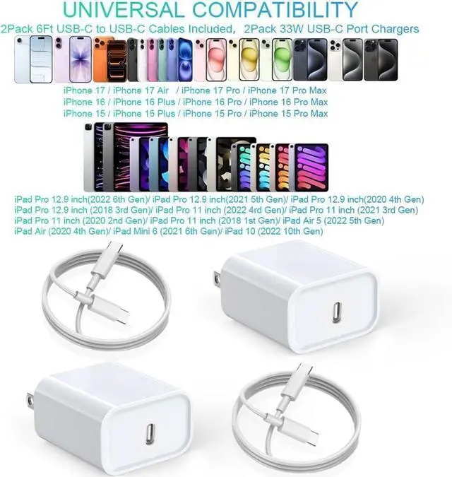 They Are Certified for High Quality Tensile And 480 Mbps High-Speed Transmission Ensuring Full Compatibility Charging and Synchronization With Your iPhone 17/16 Mobile DeviceUse This 33W USB C Wall Charger and 6-Feet Quick Charger Cable To Charge iPhone 17/ 17Air/ 17 Pro/ 17 Pro Max iPhone 16/ 16 Plus/ 16 Pro/ 16 Pro Max/ iPhone 15/ 15 Plus/ 15 Pro/ 15 Pro Max iPad Mini 6th iPad Pro 12.9 -Inch 5th /4th /3rd iPad Pro 11-Inch 3rd /2nd /1st iPad Air 4th Fast ChargingYou Will Get 2 Pack 33W PD 3.0 USB-C Wall Charger Block and 2 Pack 6Ft USB C to USB C Fast Charging Data Sync Cable.