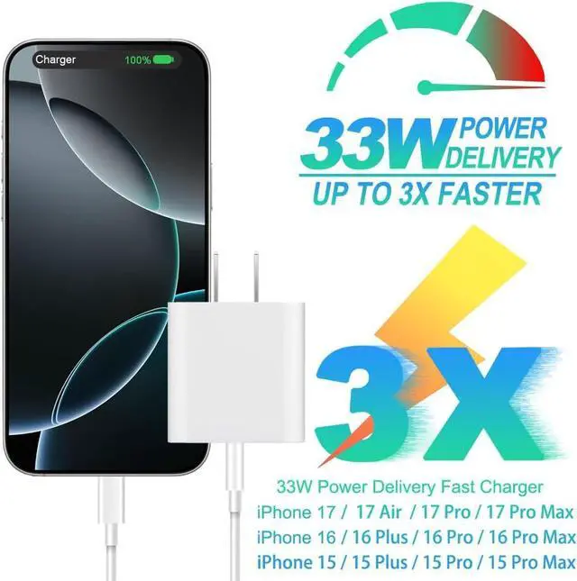 33W USB C Charge Block and Charging Cable Are Both Equipped With Smart Chips Which Can Quickly Charge New iPhone 17/16 Pro Max Full Charge Your From 0% To 50% in Just 30 Mins 3X Faster Than The Standard USB ChargerThe UL Listed iPhone 17/16 33W USB C Fast Charger Features A Multi-Protection Safety System That Protects Your Device From Overcurrent Overvoltage Short-Circuiting Overheating EtcAutomatically Matches The Current Required ey Your Device to Charge Your iPhone iPad Device Quickly Safely and ConsistentlyThe USB C to USB C Cables Are Manufactured With Original Chips and Support Ios Versions and All Future Updates.