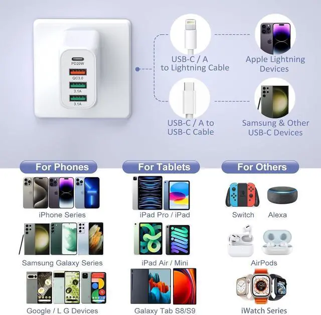 Compatible phone models (partial list): iPhone 15/15 Pro/15 Pro Max/15 Plus/14/13/12/11 Pro Max/Mini/XR/XS/SE/8/7 Plus Pad Pro/Pad Air AirPods Galaxy S23Ultra/S22/S21+/S20 FE/S10 Z Flip/Fold 5/4 Note 20/10 A13/A14/A53/A54/A03S 5G/A71 Pixel 7/6 Pro and more. [What You Get] 3 Pack 40W 4-Port USB C and USB Fast Charging Block. With so many slots you can use the new type-c cables but also wont waste the old style usb-a cords. Each of our chargers will be tested before shipped please let us know if you have any problems of our adapters. We stand behind our products.