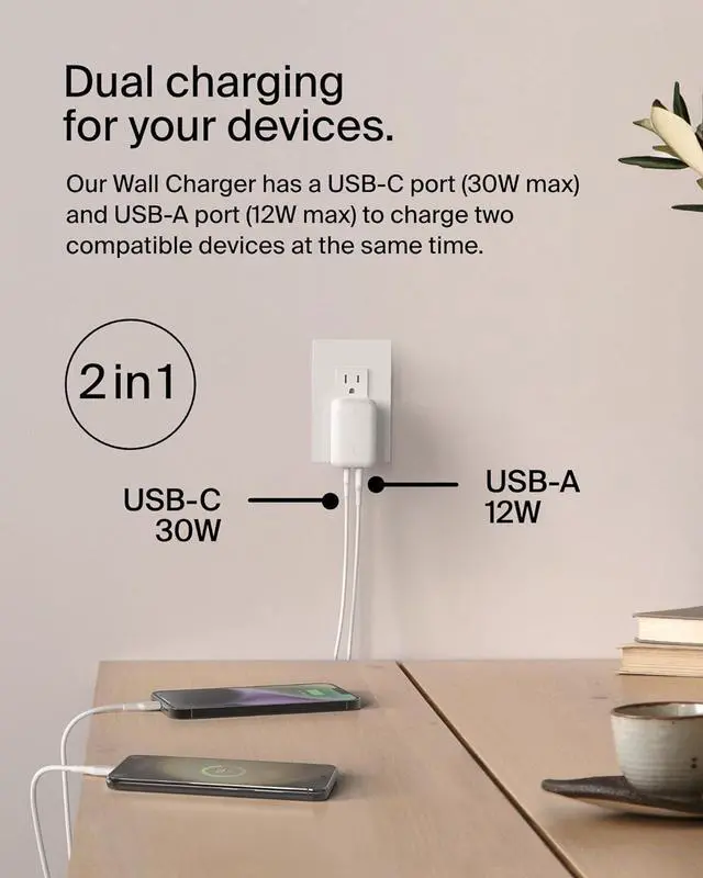 SAFE & RELIABLE: Our BoostCharge dual wall charger has gone through extensive testing to ensure a charger that charges your devices safely and reliably throughout the entire life of the product. Plus foldable prongs make it easier to travel with. SUSTAINABLY MADE W/ 2-YEAR