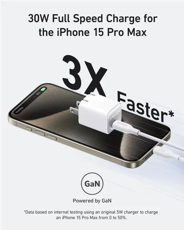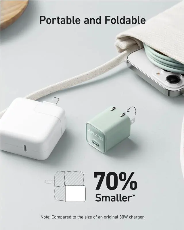 Small Yet Powerful: By swapping out silicon for Gallium Nitride (GaN) we've been able to fit 30W of power into a charger that's just 1.12 inches thick and 70% smaller than an original 30W charger.