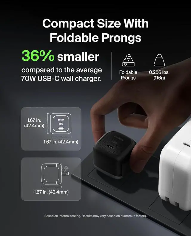 FAST CHARGING TECHNOLOGY: Our Compact Wall Charger supports fast charging of various devices charging an iPhone 16 from 0-50% in just 28 minutes or a S25 from 0-50% in 33 minutes. * Spend less time charging and more time connected to your day.