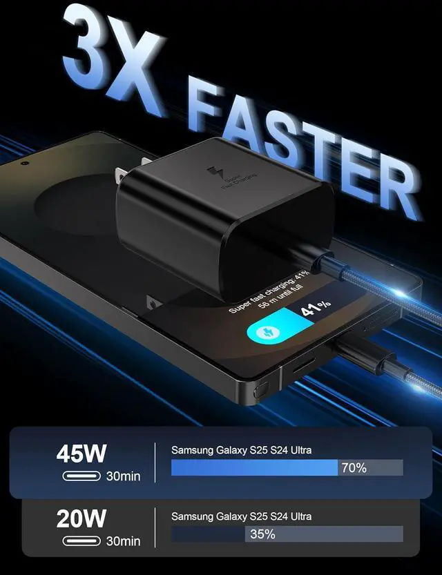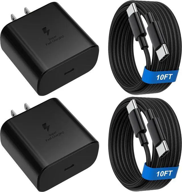 45W Super Fast Charging 2.0 Deliver blazing-fast charging with our 45W USB-C wall charger engineered with PD 3.0 technology. Charge Galaxy S25 Ultra/S24 Ultra from 0% to 50% in just 20 minutes 3x faster than 15W chargers and 40% quicker than 25W models. Perfect for Galaxy S25/S24/S23/S22 Ultra Note 20 and Google Pixel devices. Extra-Long 10FT Braided Cables Includes 2 premium nylon-braided USB-C to C cables (10FT length) for unmatched durability and flexibility. Unlike flimsy 6FT PVC cords our tangle-free design lets you charge comfortably on beds sofas or offices while supporting 5A/100W power delivery and 480Mbps data transfer.