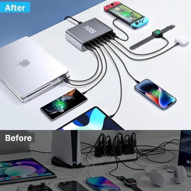 Charging Station: This 500W usb c charger block has 5 USB-C and 3 USB-A ports and can charge up to 8 devices simultaneously. It supports Android and iPhone users including providing fast USB-C charging for devices such as iPhone 17 Pro Max. The type c charging block is equipped with an intelligent power distribution system which ensures high-speed charging on all portsLaptop