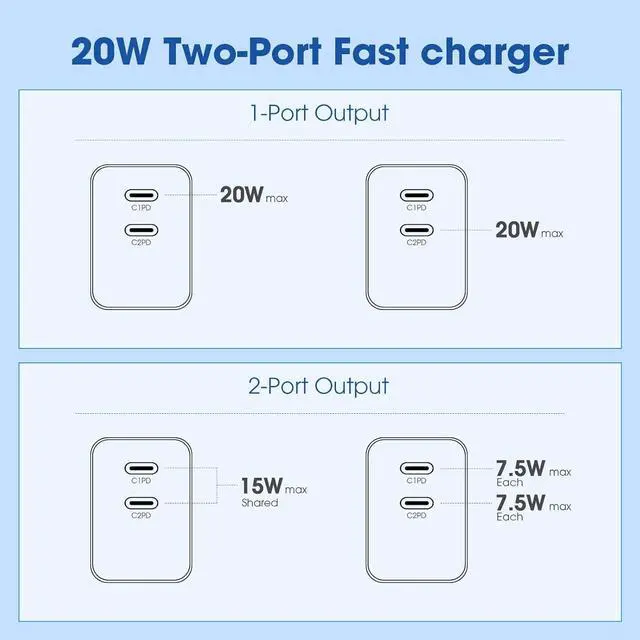 USB C Charger Compatibility: 20W PD Dual port USB-C fast Charging Block is compatible with iPhone 17/ Air/ 17 Pro/ 17 Pro Max/ 16/ 16 Plus/ 16 Pro/ 16 Pro Max/ 16e/ 15/ 15 Plus/ 15 Pro/ 15 Pro Max for iPad Pro 13/11 inch (M4) / 12.9 inch 6th/5th/4th/3rd Gen/ 11 inch 4th/3rd/2nd/1st Gen for iPad Air M3/6th/5th/4th Gen for iPad Mini 6th/7th Gen for iPad A16/10th for Galaxy S25/S24 series Z Flip 6/5