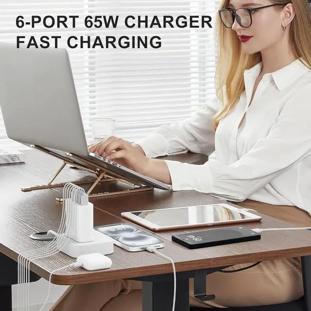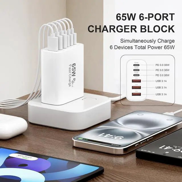 Port USB Charger: Designed for the Latest iPhone Models including iPhone 17 16 15 14. With a total of 65W power output across 6 ports (3 USB-C + 3 USB-A) allowing you to charge up to 6 devices simultaneously.