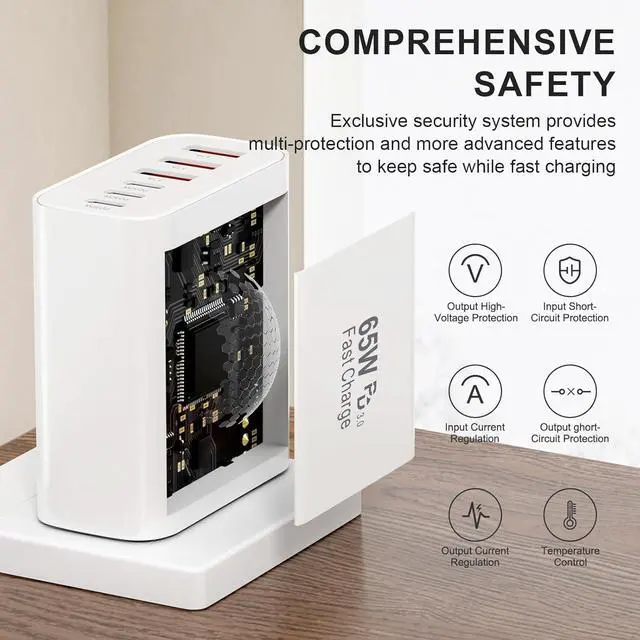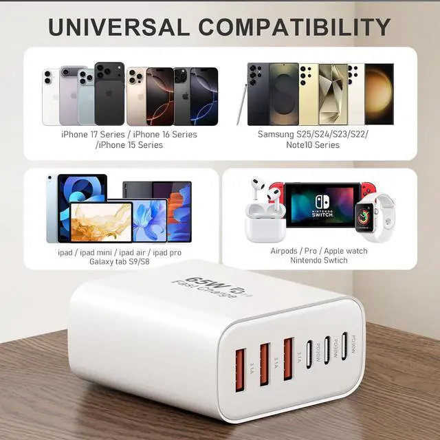Universal Compatibility: One charger for all the c type charger block great compatible for iPhone 17/17 Pro/ 17 Pro Max/17 Plus/16/16 Pro/ 16 Pro Max/16 Plus/15/15 Pro/ 15 Pro Max/15 Plus/14/14 Plus/14 Pro/14 Pro Max/iPhone 13/13 Pro Max/iPhone 12/12 Mini/12 Pro/12 Pro Max /XR/XS/X/8/7 Galaxy S25/S24/S23/S22/S21/S20/S10/S9/A12/ LG Moto and more. Safety & ReliableThe Charger block has multi protection safety system protect your devices from over current over voltage short circuit and overheating ensure charge your device safety and longevity. What You Will Get2*65W 6 Port charging block with worry-free 18-month warranty and friendly customer service. If you encounter any problems in using the charger block please feel free to contact our professional customer service team and we will offer friendly customer service within 24h.