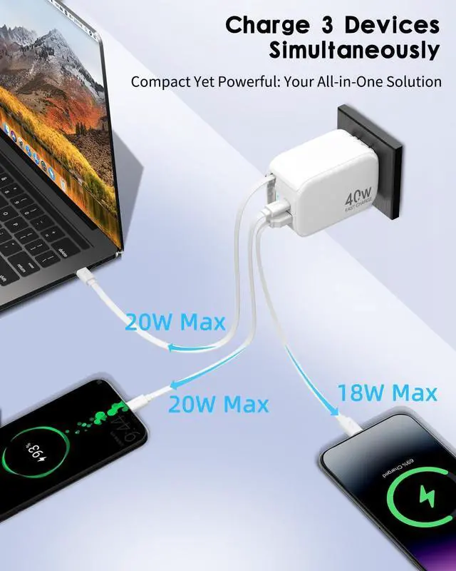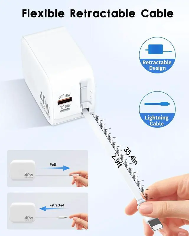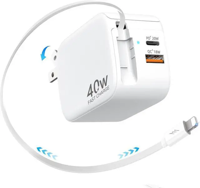 Once: Fast & Efficient! Why juggle multiple chargers? This retractable wall charger features a built-in charging cable a 20W USB-C port and an 18W USB-A port to charge 3 devices simultaneously. With 40W PD fast charging your phone tablet and laptop will be ready in no time! Perfect for