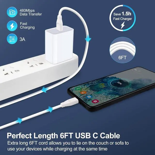 Power Delivery Fast Charging: The galaxy a14 5g charger with 20W PD 3.0 Fast USB C ports charging up to 20 Watt/ 3 Amps to charge galaxy a23 phone power 4 times faster than 1A galaxy a24 charger box enables your battery from 0 to 60% in just 30 minutes 100% power charge in 1 hour. Super Fast 6FT 60W USB C