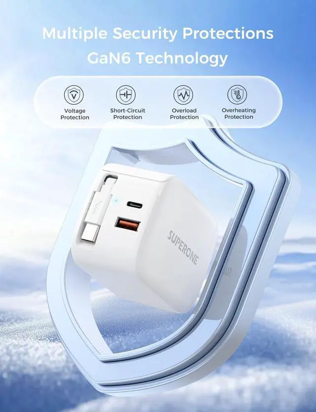 NOTE: After pulling out the cable it can be retracted by gently stretching the cable by another 1 cm.? [3-in-1 Fast Charging] The retractable iphone 16 wall charger features with a PD 20W retractable usb c cable a 20W Type-C port and an 18W USB-A port allowing you to charge up to 3 devices simultaneously at high speed. With PD 20W support your iPhone 17 Pro charges 65% in just 30 minutes and fully charges in 1 hour - saving you up to 2 hours of wait time!?? [Universal Compatibility] The usb c charger block with a retractable usb c cable Type-C port and USB-A port. With its 3-port design this charger is compatible with nearly all electronic devices including the iPhone 17/17Pro/17Air/16/16 Pro/16 Pro Max/15/14/13/12/11/SE3/XR/XS Max/X/8 Plus iPad Air/Pro/Mini Galaxy S23/S22/S21/S20 Ultra/S10/S9/S8 Plus LG Motorola Google Nexus and other digital devices.?? [Multiple Security Protections] The retractable usb c wall plug for iPhone features advanced GaN6 technology a built-in multi-protection system and high-quality microchips. GaN6 components reduce power loss and heat generation improving heat dissipation by up to 30% for more efficient charging. With comprehensive protections including overcurrent overvoltage overload and short-circuit safeguards your devices are protected ensuring smooth performance and extending battery life by up to 25%.