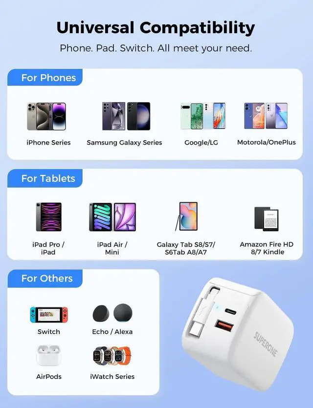 ?? [Best for Travel] SUPERONE 3-Port retractable phone charger block is ultra-compact reducing the need to carry 3 chargers while you travel and outdoor use. With its space-saving design - simply fold the plug retract the cable and slip it into your bag without scratching your device screens.??? [What You Get] SUPERONE Retractable USB C Charger Block * 1 user manual * 1 18-month warranty and our friendly customer service. All SUPERONE products come with Hassle-free 18-month warranty plus life time technical support. Any question just contact us SUPERONE team provides 24*7 day customer service to solve any problems for our valued customers.