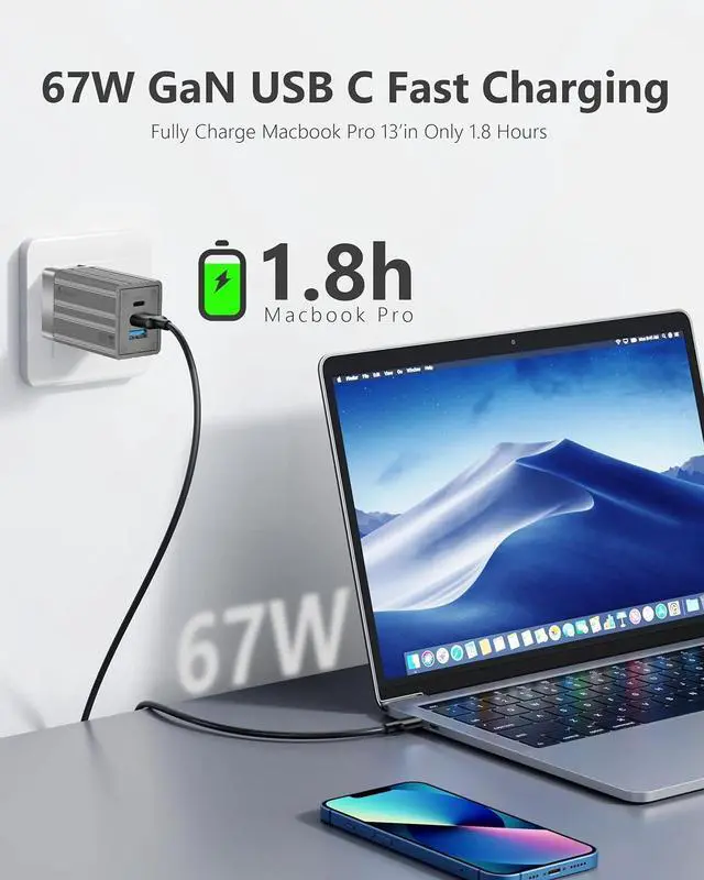 Fast ChargingBy utilizing the low heat generation and high efficiency of GaN III material the Acoucou 67W/65W super fast charger can enhance charging efficiency to 90% leading to an incredibly fast charging experience. Starting now the iPhone 13 Pro Max charging speed is three times quicker than the original 5W charger. Additionally charging the 13-inch MacBook Air from 0% to 45% only takes 30 mins. Compact DesignThanks to the GaN III technology material we can achieve a remarkable feat: fitting a 67W charging power into a charger that is 50% smaller than the original 67W MacBook Pro charger all while improving charging efficiency. Our 67W Type C Charging block can be easily folded and conveniently stored in pockets handbags and travel cases. Say farewell to the bulky and underpowered iphone charger now. Safe & ReliableTo efficiently dissipate heat the Acoucou 67/65 watt USB C charger has an independently designed layered cooling structure. The dynamic temperature sensor constantly monitors the temperature in real-time and the intelligent chip adjusts the power output accordinglyprovides protection against overcharging overvoltage overcurrent and overheating ensuring the safety of both you and your devices during the charging process. Our type c charging block is extremely fast and has been certified by ETL FCC and UTL. Multi-portsThe USB-C ports can charge up to 67W each while the USB-A port can offer a maximum power of 22.5W. When all three ports are used together they generate a total charging power of 67W. With this capability Acoucou 67W/65W GaN charger can simultaneously charge three devices such as smartphones tablets smartwatches headphones gaming consoles and more without any waiting required. Wide CompatibilityOur USB C fast charger is compatible with all mainstream devices on the market including but not limited to iPhone/Pro/Max iPad/Mini/Air/Pro MacBook/Air/Pro Galaxy Ultra/Note Surface Galaxy Book Chromebook HP LG Steam deck and more.