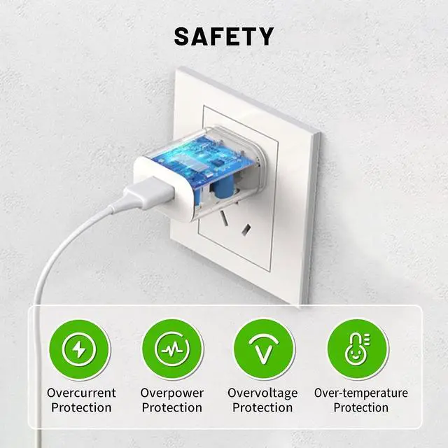 Safety: Standard USB Wall charger block with smart IC chip and premium fire proof shell form the protection system: OCP OPP OVP OTP automatically stop charging when power is full and protect your device.