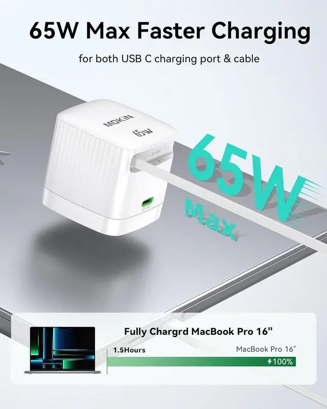 Charging Efficiency: The retractable phone charger wall plug has a USB-C port and a Type-C retractable cable for charging 2 devices at the same time. Connect a single USB C device to get a 65W max charge this USB C charger block can charge your MacBook Pro 16'' to 56% in 45 minutesPowered by