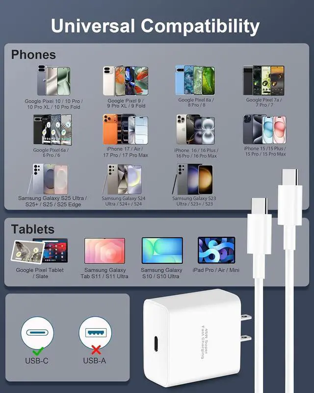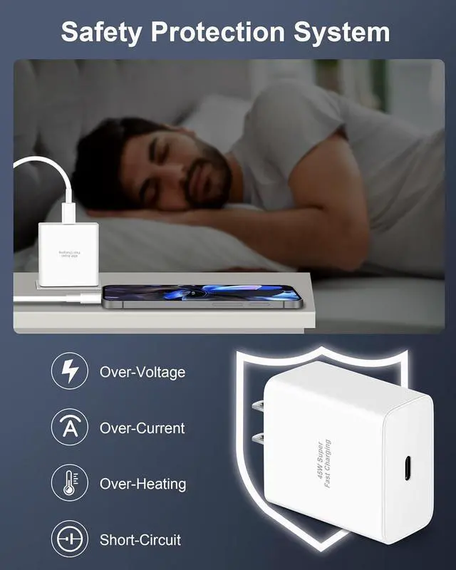 Charger Compatibility: The 45W USB C charger block fast charging for Google Pixel 10/10 Pro/10 Pro XL/10 Pro Fold/9/9 Pro/9 Pro XL/Fold/8/7/6/5 Pro/XL iPhone 17/17 Pro Max/17 Pro/Air/16/16e/16 Plus/16 Pro/16 Pro Max/15/15 Plus/15 Pro/15 Pro Max iPad Pro/Air/Mini Galaxy S25/S24/S23/S22 Ultra Moto LG Tablet Laptop Android Phones and other USB C devicesSafe and