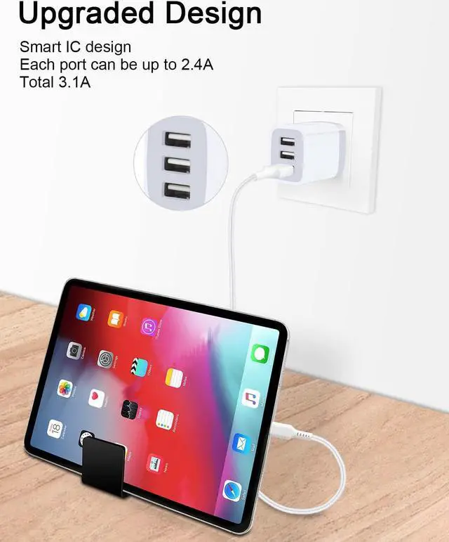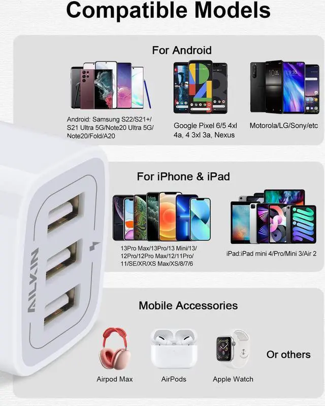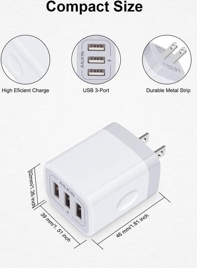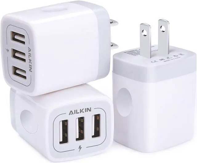 Safety assuranceAILKIN's wall charger has a protection system against overcharging over-current and overheating. The charger block will automatically stop charging when power is full which can maximumly protect your device. LightweightHome charger adapter allows charging at home or in the office via USB cable connection. Simply plug in the USB cable and plug the adapter into the wall. Compact lightweight portable stylish and easy to store. MultipurposePure white color cube matches all USB cable cords or matches your phones. You can share them with your lover family or friends. PACKAGE INCLUDE - 3Pack 3 Port USB wall chargers.