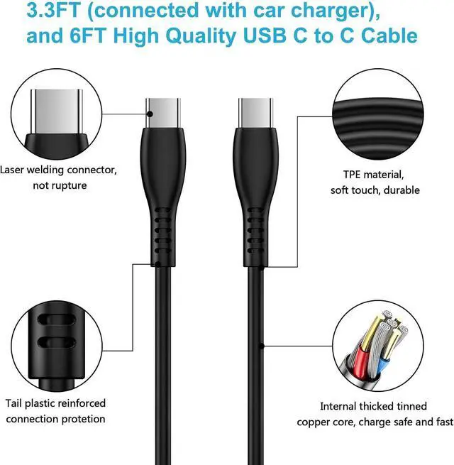 Charging will stop automatically when the battery is fullUnique DesignCar charger connected with a 3.3 ft c cable blue indicator helps to charge at night it is suitable for all 12V-24V vehicles snug fit car cigarette lighter; Small size usb c wall charger with a 6ft usb c cable 100-240V broadband voltage design US standard highly adaptable to different level of voltage 6ft extra long length you can use freely on sofa bed office no worry of distance limitedWhat